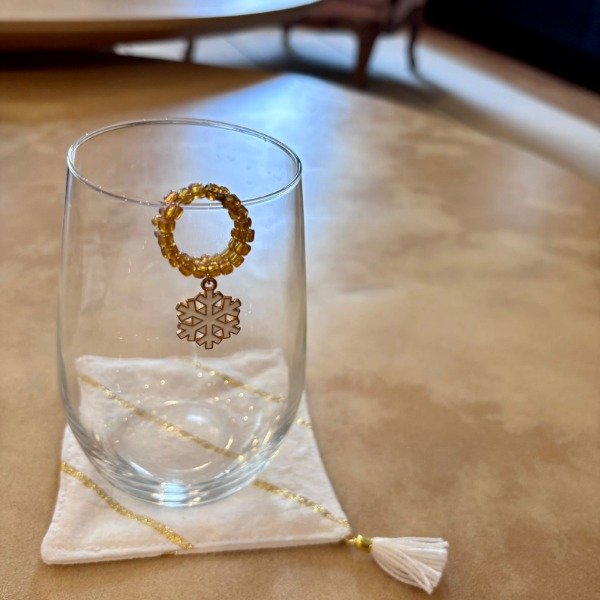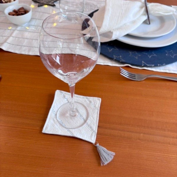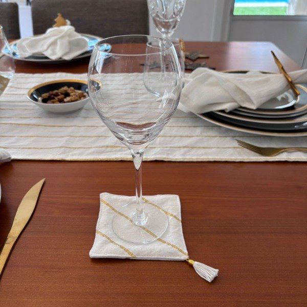 Set de 6 posavasos de tusor con rayas de lurex y delicadas borlas decorativas, hechos a mano.