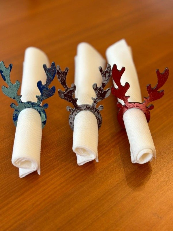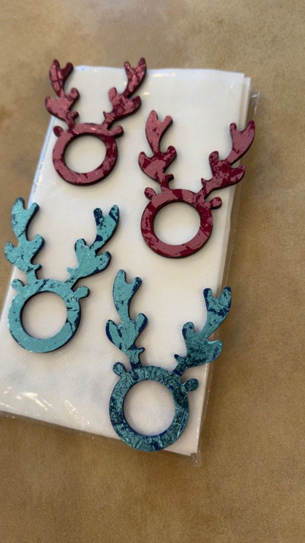 El pack incluye 4 servilleteros forma reno realizados a mano, en madera de 3 mm de espesor en color azul (x 2U. ) y rojo (x 2U. ) y 4 servilletas simil tela.